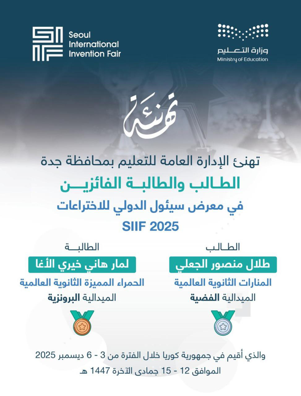 Al Hamraa International Schools is proud to announce that our student Lamar Hani Al-Agha has won the Bronze Medal at the Seoul International Invention Fair (SIIF) 2025, thanks to the grace of Allah and her outstanding effort and creativity.